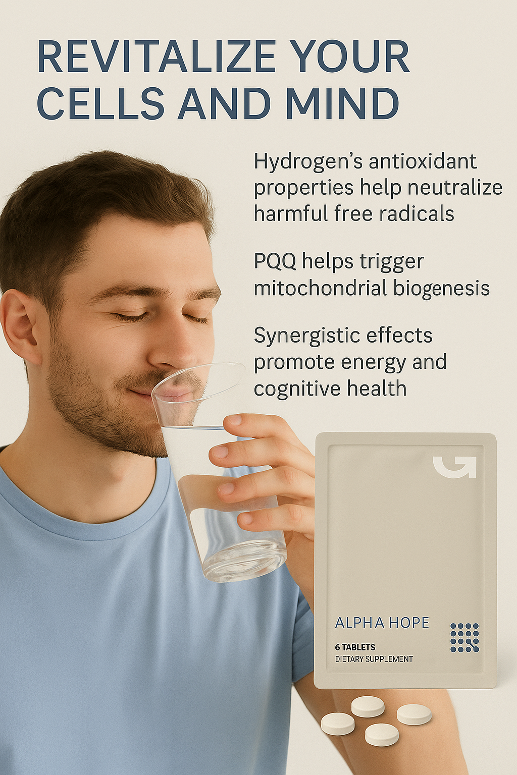 Alpha Hope™ is a next-generation hydrogen-water tablet that combines Molecular Hydrogen (H₂) with Pyrroloquinoline Quinone (PQQ), two powerful antioxidant ingredients that work together to support cellular energy, brain performance, and overall wellness. Just drop a tablet into water to create refreshing, hydrogen-rich water that complements your hydrogen inhalation and hydrogen water devices.