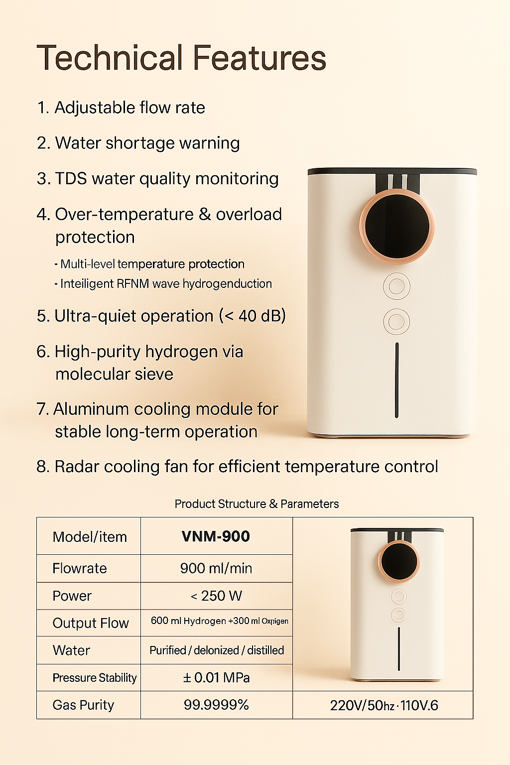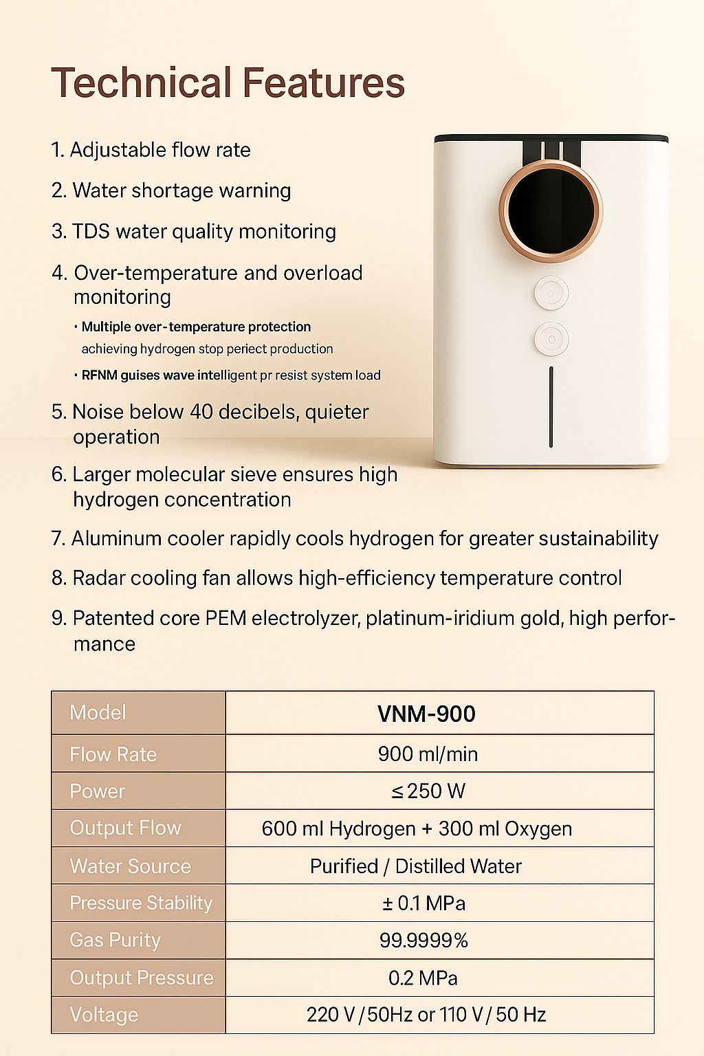 Experience premium-grade hydrogen inhalation therapy with the VitaNexusH2 Mini (900 ml/min) — engineered with German Technology · Japan Design to deliver ultra-pure 99.9999% hydrogen using advanced PEM electrolysis.